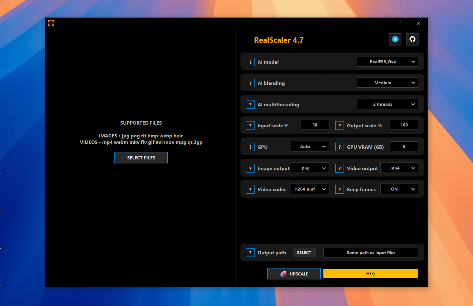RealScaler is a Windows app powered by RealESRGAN AI to enhance, upscale and de-noise photos and videos.